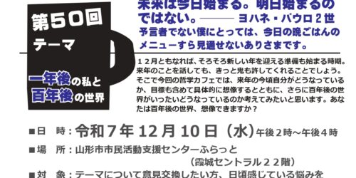 2025年11月17日 第50回哲学カフェ ~1年後の私と100年後の世界~ 山形市市民活動支援センターより【第50回哲学カフェ ~1年後の私と100年後の世界~】のお知らせです。 新たな年に向けて... カテゴリー アミルからのお知らせ/事務局通信