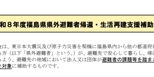 2026年4月7日 令和8年度福島県県外避難者帰還・生活再建支援補助金募集について 「令和8年度福島県県外避難者帰還・生活再建支援補助金」の募集が開始されましたのでお知らせします。 申請期間:令和8年3月... カテゴリー 事務局通信
