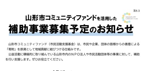 2026年4月7日 令和8年度山形市コミュニティーファンド(市民活動支援基金)募集について 「令和8年度山形市コミュニティーファンド(市民活動支援基金)」の募集が開始されましたのでお知らせします。 募集期間:令和... カテゴリー 事務局通信
