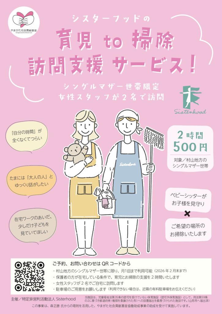 Home > NPO支援事業 / 他団体からのお知らせ 育児 to 掃除 訪問支援サービス! シスターフッド より【育児 to 掃除 訪問支援サービス!】のお知らせです。 ・ 村山地方のシングルマザー世帯に限り、月1回まで利用可能(2026年2月末まで)・ 保護者の方が在宅している条件で、育児とお掃除の支援を2時間いたします・ 女性スタッフが2名でご自宅に訪問します・ 駐車場のご用意をお願いします ⬥チラシは こちらから ご確認ください。 ⬥ランディングページは こちらから ご確認ください。 Categories:NPO支援事業他団体からのお知らせ 関連記事 NPO支援事業 / アミルからのお知らせ / お知らせ 新型コロナウイルス感染症対策に係るNPO等支援のための緊急アンケート 集計結果 他団体からのお知らせ イギリスの遊び場から見た子どもの遊び環境づくり~子どもの遊びが結んだ縁「ロンドン-東京 遊びの姉妹都市」から学ぶ~ 事務局通信 / 他団体からのお知らせ こども食堂ゆうあいキッチンかみのやま(5月21日開催) 他団体からのお知らせ こども食堂 ゆうあいキッチンかみのやま 他団体からのお知らせ こども食堂 ゆうあいキッチンおおさと 他団体からのお知らせ NPOのSDGs全国調査報告フォーラム~SDGsの先を見据え、NPOの強みを活かしてつながるために~ 前の投稿 NPO広報講座 Canvaで動画作成(基礎編)