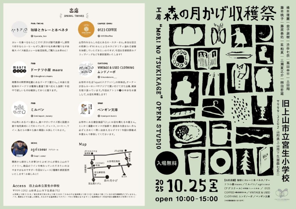 Home > 他団体からのお知らせ / 地域づくり事業 工房 森の月かげ収穫祭 工房 森の月かげより、収穫祭のお知らせです。 東北芸術工科大学に関係するアーティストが、2015年4月より上山市の廃校である旧上山市立宮生小学校を、共同アトリエ「工房 森の月かげ」として活用をスタートしました。毎年秋にお披露目会を開催し、山形の豊かな実りある秋に個々の成果物を「収穫祭」としてお披露目いたします。 ⬥日 時:10月25日(土) 10時~15時 ⬥場 所:旧上山市立宮生小学校 詳しくはこちらよりご確認ください。 チラシ ・ 詳細 Categories:他団体からのお知らせ地域づくり事業 関連記事 他団体からのお知らせ 「DV防止講座」身近に潜む暴力”モラルハラスメント”を知る 他団体からのお知らせ 講話会「子どもが主役になる暮らし」 地域づくり事業 霞城歴史講座「最上義光公と伊達政宗公の拘わりについて」 他団体からのお知らせ 木製ジャングルジム「くむんだー」がやってくる 他団体からのお知らせ 積水ハウスマッチングプログラムのご案内 他団体からのお知らせ 【山形県 企画振興部 市町村課からのお知らせ】「地域未来フォーラム」における「集落調査作成実務研修」開催します。 前の投稿 育児 to 掃除 訪問支援サービス! 次の投稿 みんなで楽しむ美術館とナビレンス体験会のお知らせ