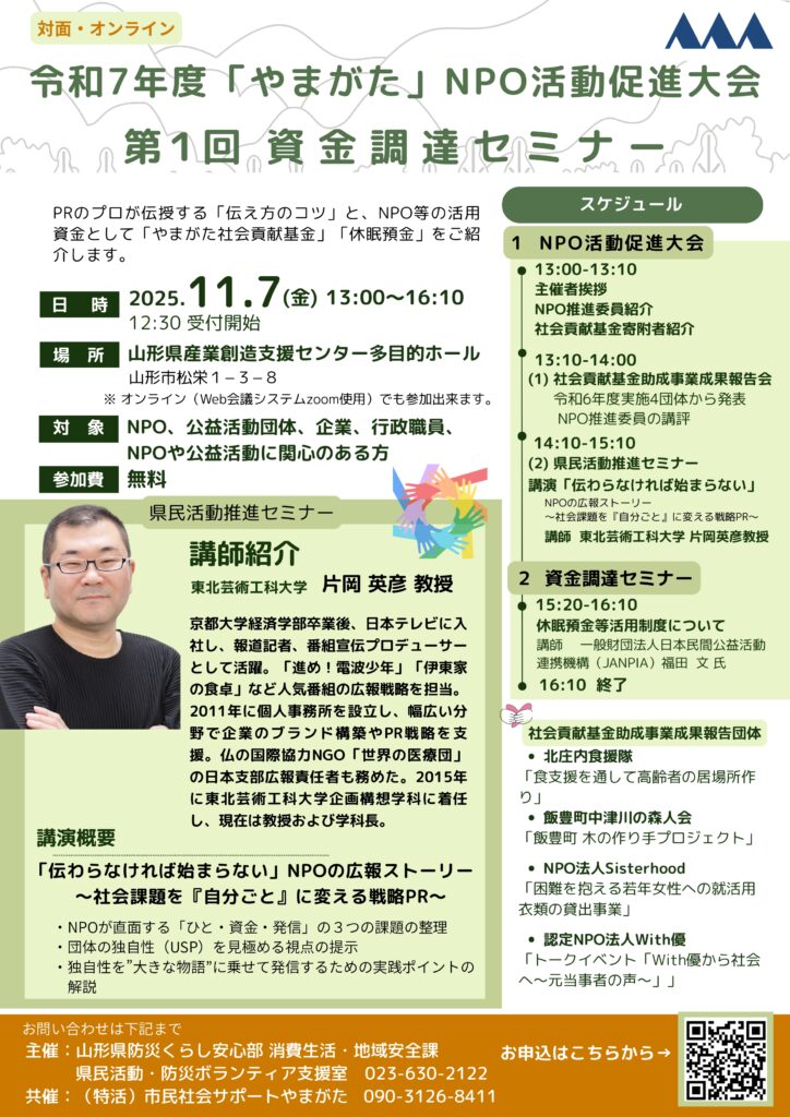 山形県防災くらし安心部消費生活・地域安全課 県民活動・防災ボランティア支援室より「令和7年度やまがたNPO活動促進大会・第1回資金調達セミナー」のお知らせです。