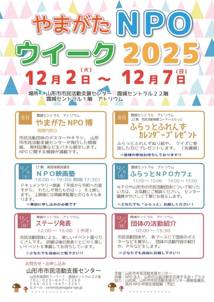 山形市市民活動支援センターより「やまがたNPOウィーク2025」のお知らせです。