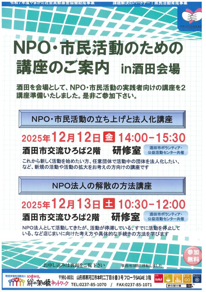 Home > 他団体からのお知らせ NPO・市民活動のための講座のご案内 in酒田会場 特定非営利活動法人 やまがた絆の架け橋ネットワークより「NPO・市民活動のための講座のご案内 in酒田会場」のお知らせです。 チラシ・申込は こちらから ダウンロードできます Categories:他団体からのお知らせ 関連記事 他団体からのお知らせ NPO法人20世紀アーカイブ仙台からのお知らせ NPO支援事業 / 他団体からのお知らせ フリースクールにおける「やまごやの伴走型支援」第1回活動報告会 他団体からのお知らせ 人との関係づくりが苦手な人や「参加」への制約を抱える人へのボランティア活動支援とは? 他団体からのお知らせ 目指せ!カーボンニュートラルSDGs実践セミナー 他団体からのお知らせ 「NPO会計サポート・コミュニティ ~あるべき会計 サポートを語り合おう~」講座開催について 他団体からのお知らせ 令和5年度 みやぎ NPOフォーラム 「NPOの世代交代と事業継承を考える」 前の投稿 情報誌「とぴあす」第104号のお知らせ 次の投稿 NPO・市民活動なんでも相談会