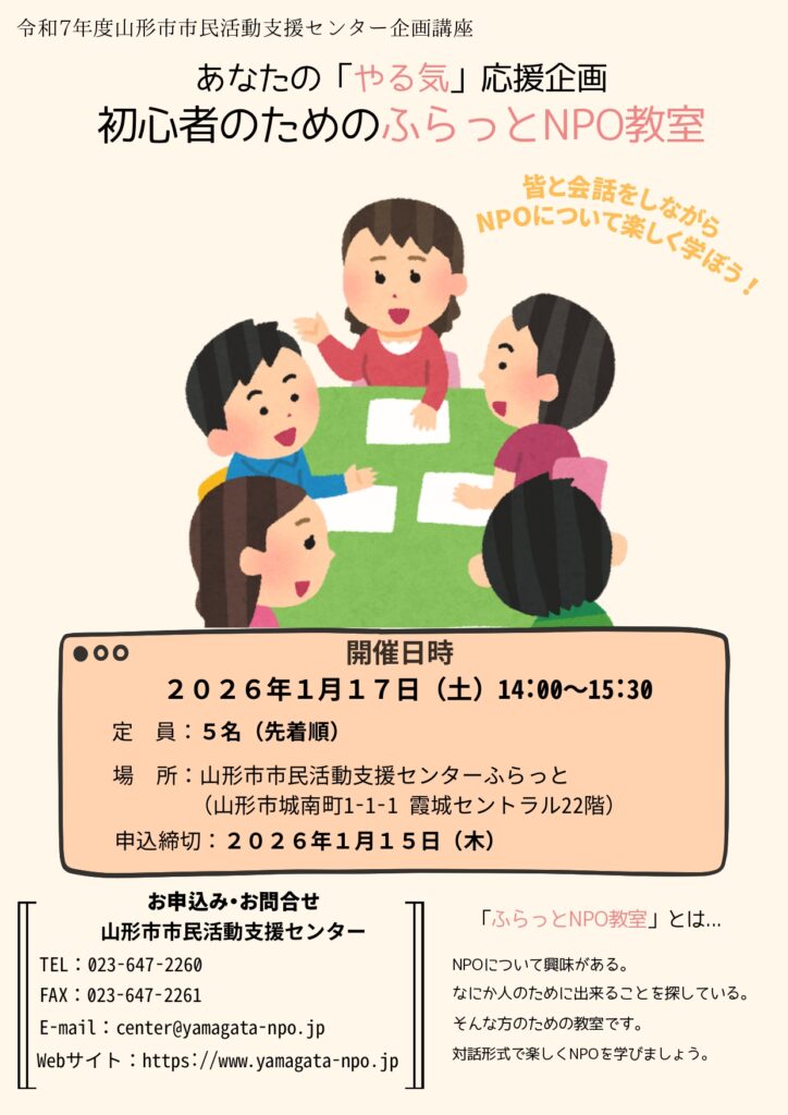 【あなたのやる気応援企画 初心者のためのふらっとNPO教室】のお知らせです。