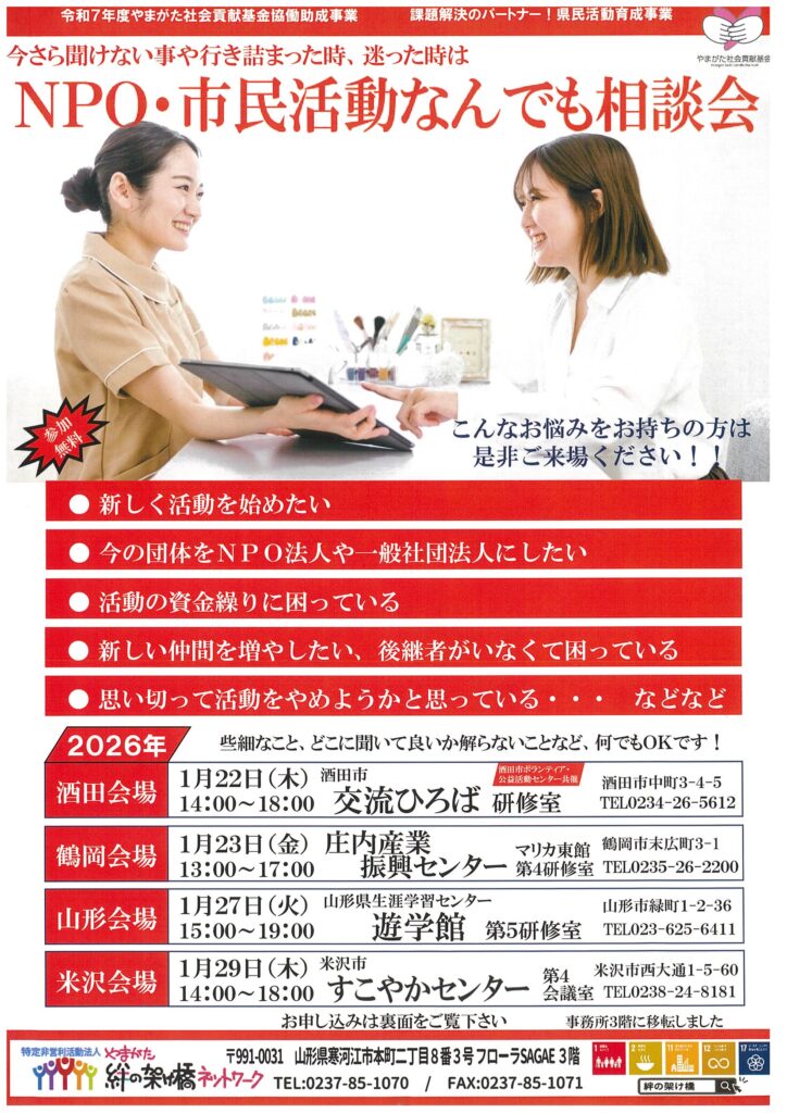 Home > 他団体からのお知らせ NPO・市民活動なんでも相談会 特定非営利活動法人 やまがた絆の架け橋ネットワークより「NPO・市民活動なんでも相談会」のお知らせです。 チラシ・申込は こちらから ダウンロードできます Categories:他団体からのお知らせ 関連記事 他団体からのお知らせ 【助成金情報】<公益信託荘内銀行>ふるさと創造基金 他団体からのお知らせ 会員サロン「アフターコロナの働き方~みなさんどうしてますか?」 他団体からのお知らせ ≪助成金情報≫公財トヨタ財団 「未来の担い手と創造する新しいコミュニティ― 地域に開かれた仕事づくりを通じて―」 他団体からのお知らせ 外国人・支援者対象 社会福祉の基礎を学ぼう 他団体からのお知らせ やまがた環境展2023 他団体からのお知らせ 目指せ!カーボンニュートラルSDGs実践セミナー 前の投稿 助成金 紹介講座