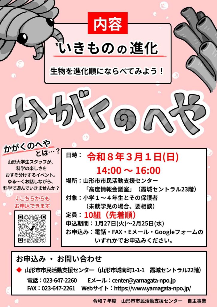 Home > アミルからのお知らせ / 事務局通信 親子向け科学イベント かがくのへや 山形市市民活動支援センターより【親子向け科学イベント かがくのへや】のお知らせです。 ⬥チラシは こちらから ダウンロードできます。⬥申込用紙は こちらから ダウンロードできます Categories:アミルからのお知らせ事務局通信 関連記事 アミルからのお知らせ / 事務局通信 年末年始お休みのお知らせ 事務局通信 パワーポイントでチラシ作成講座開催のお知らせ アミルからのお知らせ / やまがた女性のつながりサポート事業 生理用品の配布と女性が気軽に立ち寄れる交流スペース・イベントのご案内 事務局通信 金曜プライムタイム第1弾 あなたの「やる気」応援企画 初心者のための”ふらっと”NPO教室 事務局通信 第22回 哲学カフェ 道具としての言葉 事務局通信 「4コマ劇場 ふらっとふれんずとなかまたち」のお知らせ 前の投稿 「不登校」を考える 対話キャラバンinやまがた