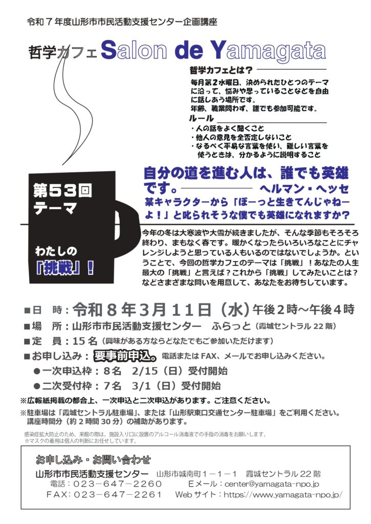 Home > アミルからのお知らせ / 事務局通信 第53回哲学カフェ わたしの「挑戦」! 山形市市民活動支援センターより『第53回哲学カフェ わたしの「挑戦」!』のお知らせです。 チラシ・申込用紙は こちらから ダウンロードできます。 Categories:アミルからのお知らせ事務局通信 関連記事 事務局通信 2022年度(第20回)ドコモ市民活動団体助成事業募集開始のお知らせ 事務局通信 7月18日開催 「こども食堂ゆうあいキッチンおおさと」 事務局通信 ワイナリー「Voyage de YUUAI」のお知らせ 事務局通信 第18回 哲学カフェ 「悪」の正体 事務局通信 あなたも「とぴボラ」してみませんか? 事務局通信 オンラインイベント「子ども支援の現場から<子どもの権利>を考える会」開催のお知らせ 前の投稿 親子向け科学イベント かがくのへや
