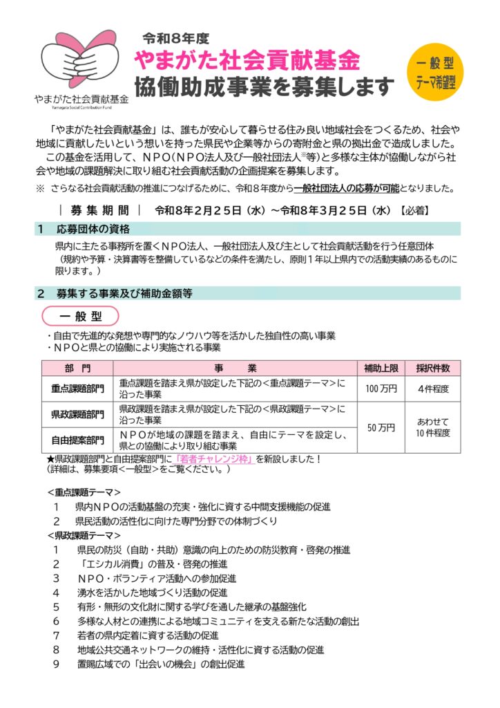 「令和8年度やまがた社会貢献基金協働助成事業」の募集が開始されましたのでお知らせします。