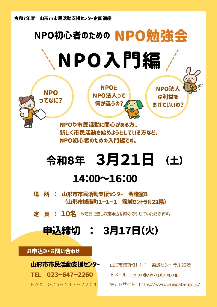 山形市市民活動支援センターより【NPO初心者のためのNPO勉強会~NPO入門編~】のお知らせです。