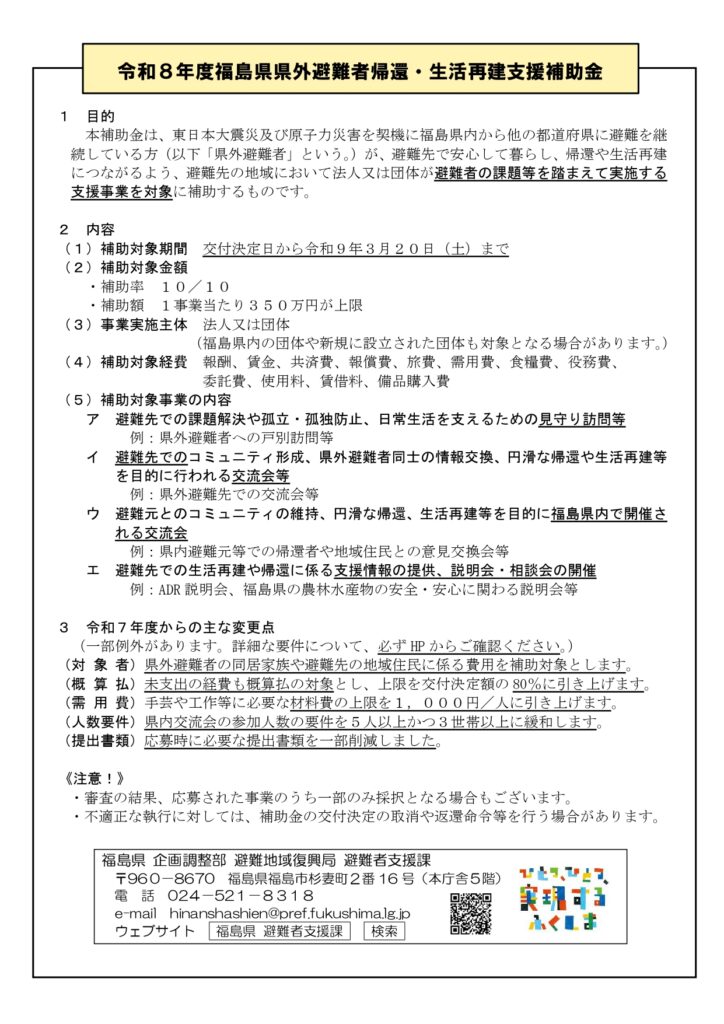 「令和8年度福島県県外避難者帰還・生活再建支援補助金」の募集が開始されましたのでお知らせします。