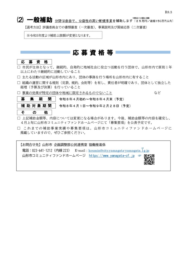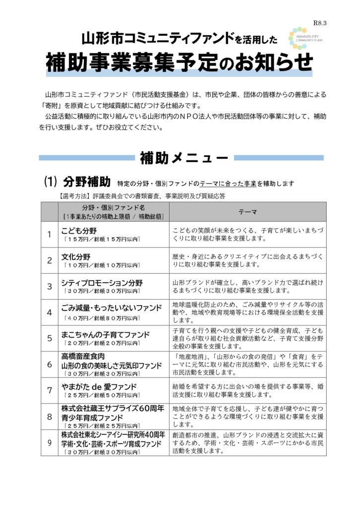 令和8年度山形市コミュニティーファンド(市民活動支援基金)募集について