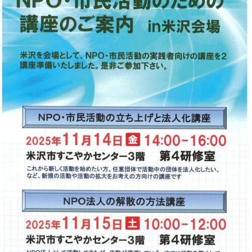 特定非営利活動法人 やまがた絆の架け橋ネットワークより「NPO・市民活動のための講座のご案内 ㏌米沢会場」のお知らせです...