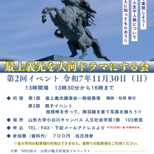 特定非営利活動法人 山形の魅力再発見プロジェクトより「最上義光を大河ドラマにする会」のお知らせです。 ⬥日 時:11月3...