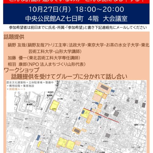 特定非営利活動法人まちづくり山形より『山形市中心市街地まちづくり計画情報共有ワークショップ』のお知らせです。 ⬥日 時:...