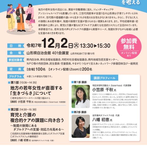 山形県健康福祉部地域福祉推進課より ―地域共生社会の実現に向けて― 「若年女性支援」と「ダブルケア」を考えるのお知らせで...