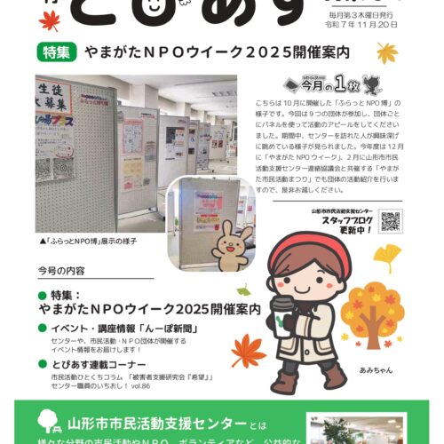 山形市市民活動支援センターより発行している情報誌「とぴあす」第104号のお知らせです。 ※掲載している情報は、発行日(毎...