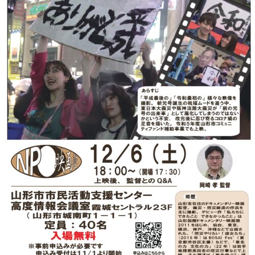 山形市市民活動支援センターより【NPO映画塾 ~ドキュメンタリー映画で考える社会課題~】のお知らせです。 改元の節目、時...