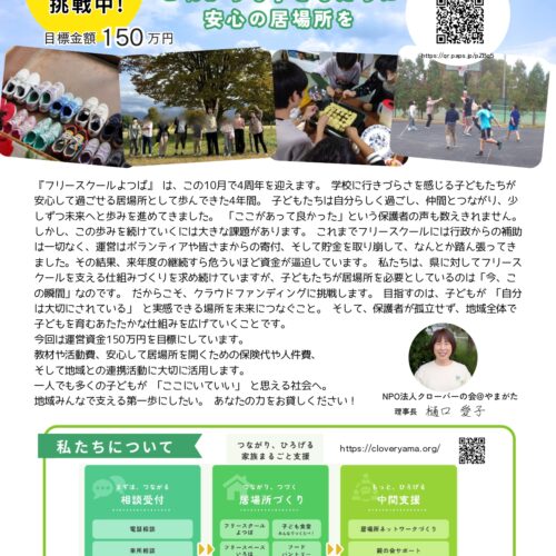 NPO法人クローバーの会@やまがたより「クラウドファンディングに挑戦中! これからも子どもたちに安心の居場所を」のお知ら...