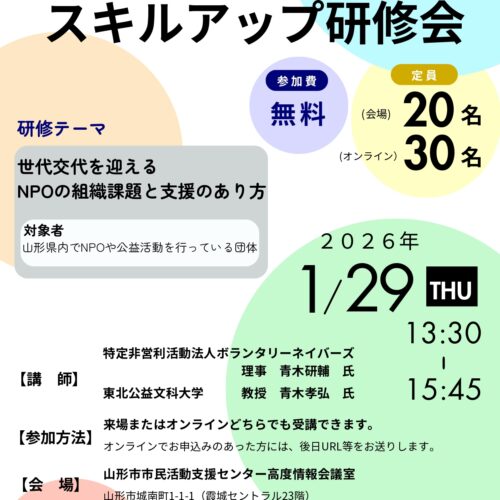 NPO法人 山形の公益活動を応援する会・アミルより「NPO中間支援組織 スキルアップ研修会」のお知らせです。 【世代交代...