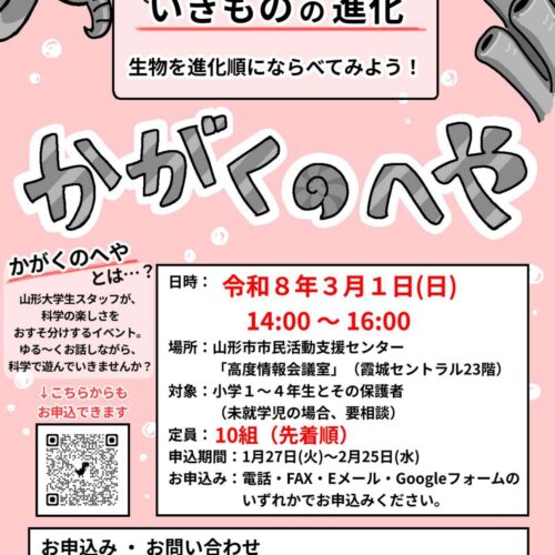 山形市市民活動支援センターより【親子向け科学イベント かがくのへや】のお知らせです。 ⬥チラシは こちらから ダウンロー...